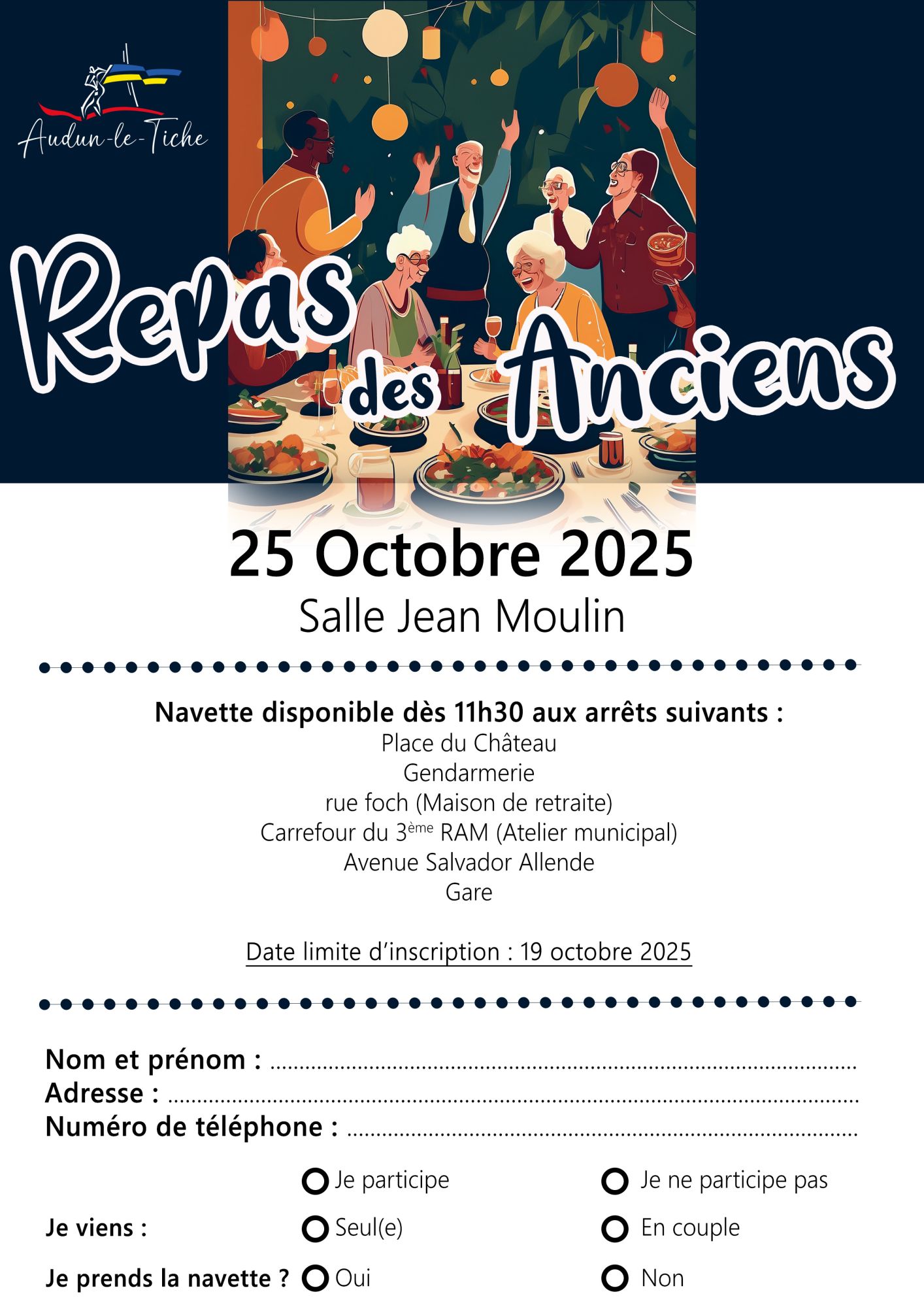 Le CCAS convie les plus de 65 ans à son traditionnel Repas des Anciens, le 25 OCTOBRE 2025 à 12h, Salle Jean Moulin.
