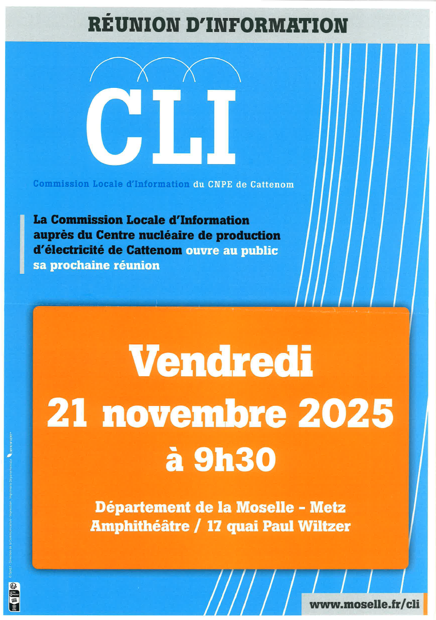 La prochaine réunion publique de la CLI de Cattenom se tiendra le 21 novembre au Conseil Départemental de la Moselle.